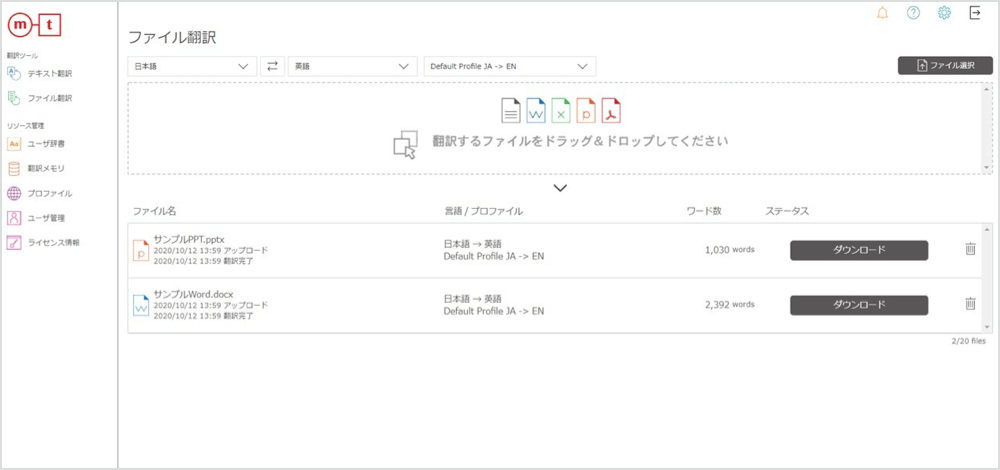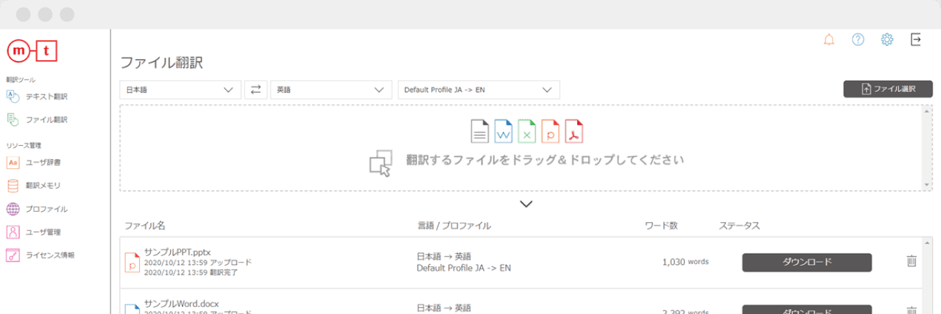 Word/PPT/PDF/Excelなどのファイルをアップロードして、ファイルの文章を翻訳処理します。