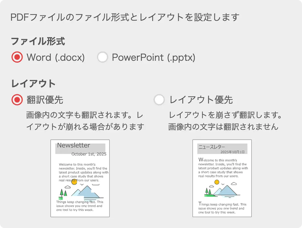 ファイル翻訳時に​「レイアウト優先」を​選択できるようになりました。