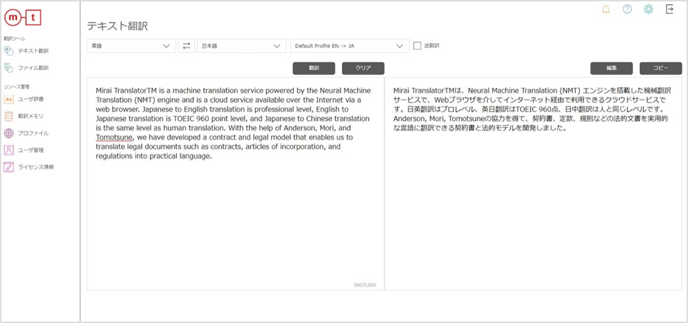 高い精度のニューラル機械翻訳エンジンで、テキストを翻訳可能。翻訳言語を選択し翻訳ボタンをクリックすると、原文が翻訳されます。逆翻訳機能も搭載。訳文を再翻訳することで、翻訳文が適切に翻訳処理されているかを確認することができます。