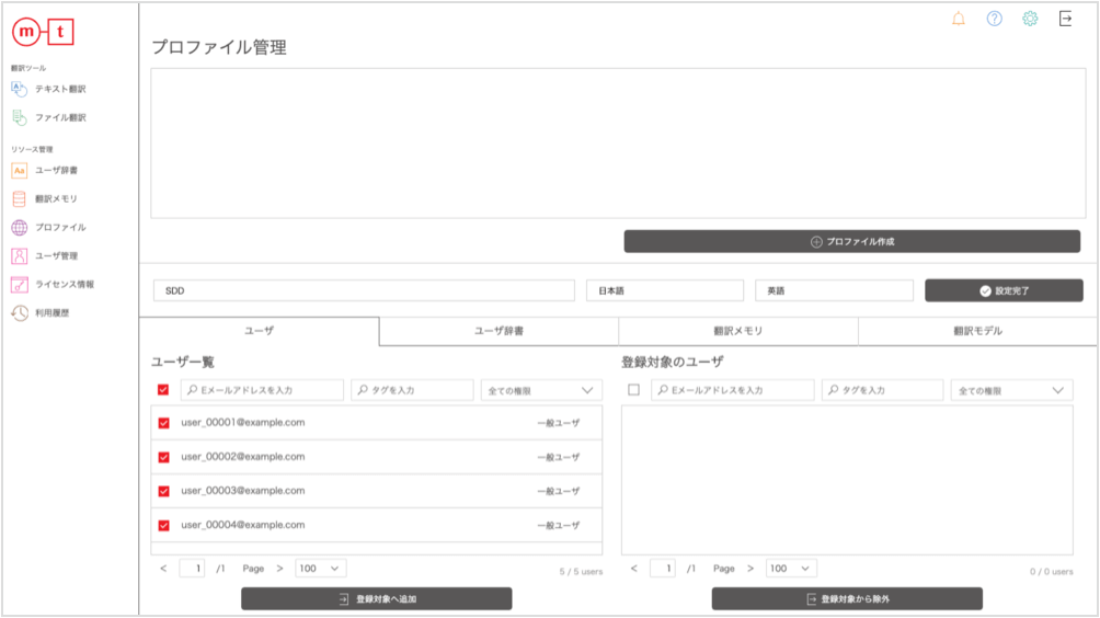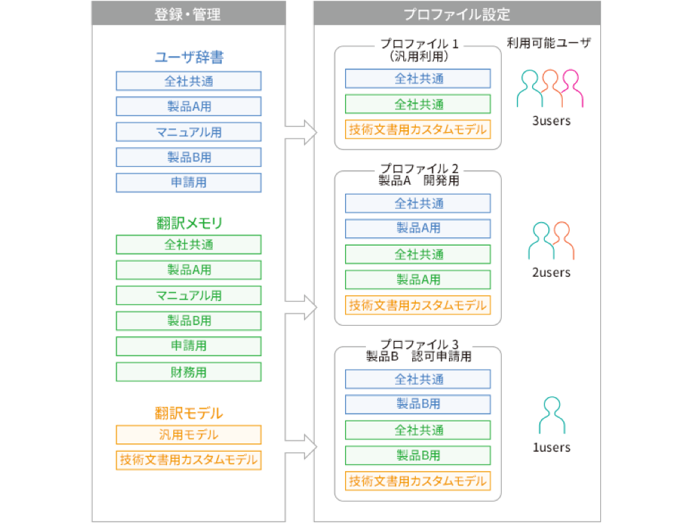 カスタマイズ機能で登録されたリソース(ユーザ辞書/翻訳メモリ)をプロファイルとして設定することで組織内で管理・活用できます。用途別に、ユーザ辞書と翻訳メモリおよび翻訳モデルを組み合わせ、プロファイルとして登録します。プロファイルごとに、使用可能なユーザを割り当てることが可能です。